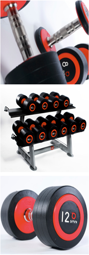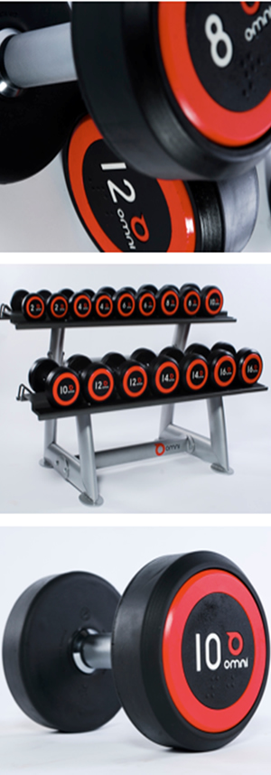 Omni Heavyduty PU Dumbbell Pairs Range is the result of the highest standards in design, engineering, and manufacturing. Design - this is second generation concept after his signature design for Life Fitness by Simon Bolton. It features red ringed endcap, large white lettering for easy reading from distance, recesssed letters for durability, flattned edges to reduce impact when dropping, unique inner endcap for customizatoin for special customers, unique ribs on weights to add flavor of traditional dumbbell plates, contoured handle for ergo grip, Enbossed Multiple Braille is placed near the inner edge for easy access to the disabled; Engineering & Manufacturing: the construction of this dumbbell can withstand repeated radical droppings from 2 meters to hard concrete floor, tri-color molded CPU endcaps for complete integrity avoiding peel-offs & tearing-offs, the carefully crafted skin texture set it apart from the normal sand blasting which everybody else use, solid steel alloy handle featuring ergo grip, high precision knurling, and long lasting nikel finish, CPU material for weight ends are of the highest quality, which set us apart from the crowd who use cheap injection molded TPU, which will crack with radical dropping on concrete floor.